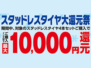キャンペーン一覧 ホーム キャンペーン一覧 スタッドレスタイヤ大還元祭 – 最大1万円還元!2025年冬もオートバックスはタイヤが安い 10月17日(金)から11月16日(日)まで実施 凍結路面・雪上路面で安定走行!冬/年末年始を安心&安全にド アルミホイール最大税込5,500円下取り保証 – 今なら下取りで新規タイヤ&ホイールの購入がお得! 10月17日(金)から11月16日(日)まで実施 人気のキャンペーン!タイヤ&ホイール新規購入時に不要となる カーナビ大還元祭 – 2025年秋 オートバックスなら購入金額に応じて最大7万円還元! 10月17日(金)から11月3日(月・祝)まで実施 購入金額に応じて最大7万円還元!2025年秋冬のドライブ 2025年-2026年 オートバックスヒートアップキャンペーン – Tune&Dress up スポーツパーツが安い! 2026年3月31日(火)まで実施中 2026年3月31日(火)までメーカー希望小売価格から最大45%OFF 見積り依頼歓迎!車検後も安心がつづくオートバックス車検 いつでも実施 初めての方、女性の方でも安心!安心&お得なオートバックス車検。 3月・9月は車検を迎えるクルマ 安全点検を無料で実施しています いつでも無料で実施 安心・快適ドライブのためにドライブ前/後にオートバックスで安全点検をしましょう! オート