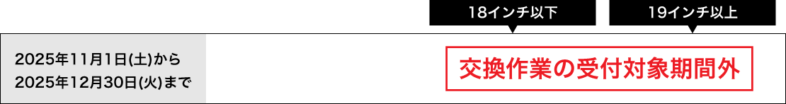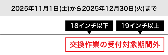 「オートバックス以外で購入済みタイヤの交換予約」に関しては2025年11月1日(土)から2025年12月30日(火)までの交換作業予約をお断りしています。その期間以外での予約をお願いいたします。
